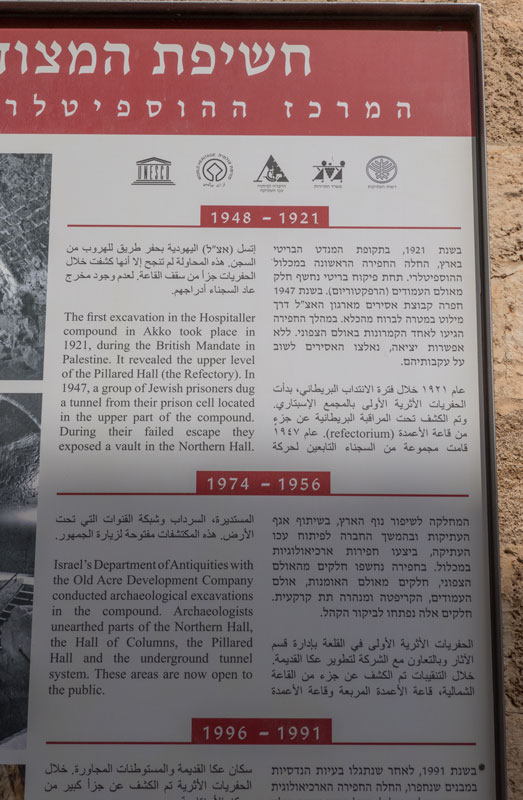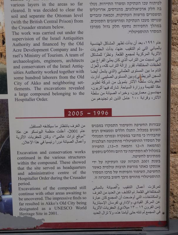 The crusader castle was destroyed by the Arabs after they conquered the Crusaders, to prevent the Crusaders from using it if they returned. Over time, the city of Acre was built over the ruins. Excavations of the ruins under the city have revealed what is visible today.