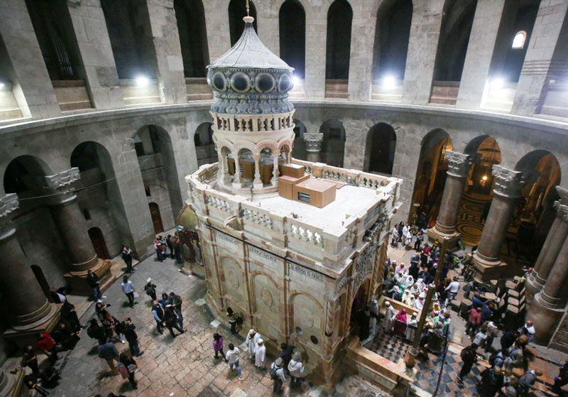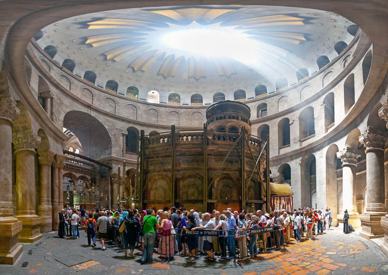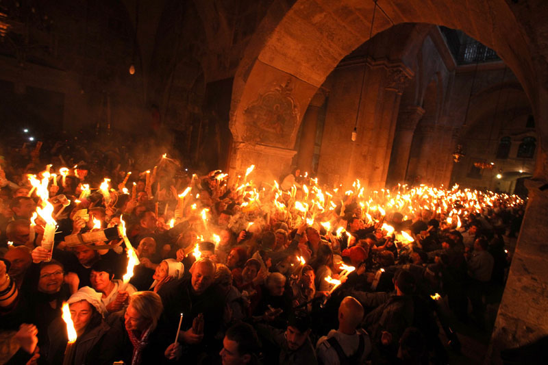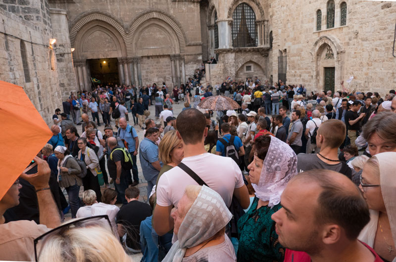 I also found a story about a ceremony at Easter where the clerics emerge from the Aedicule with a lit candle and then light some of the pilgrims' candles. The pilgrims then light other pilgrims' candles until the fire is passed to the end of the line of pilgrims, symbolizing, I suppose, the spread of Christianity through the world. Just the thought of that in a building with limited exits scares the heck out of me.