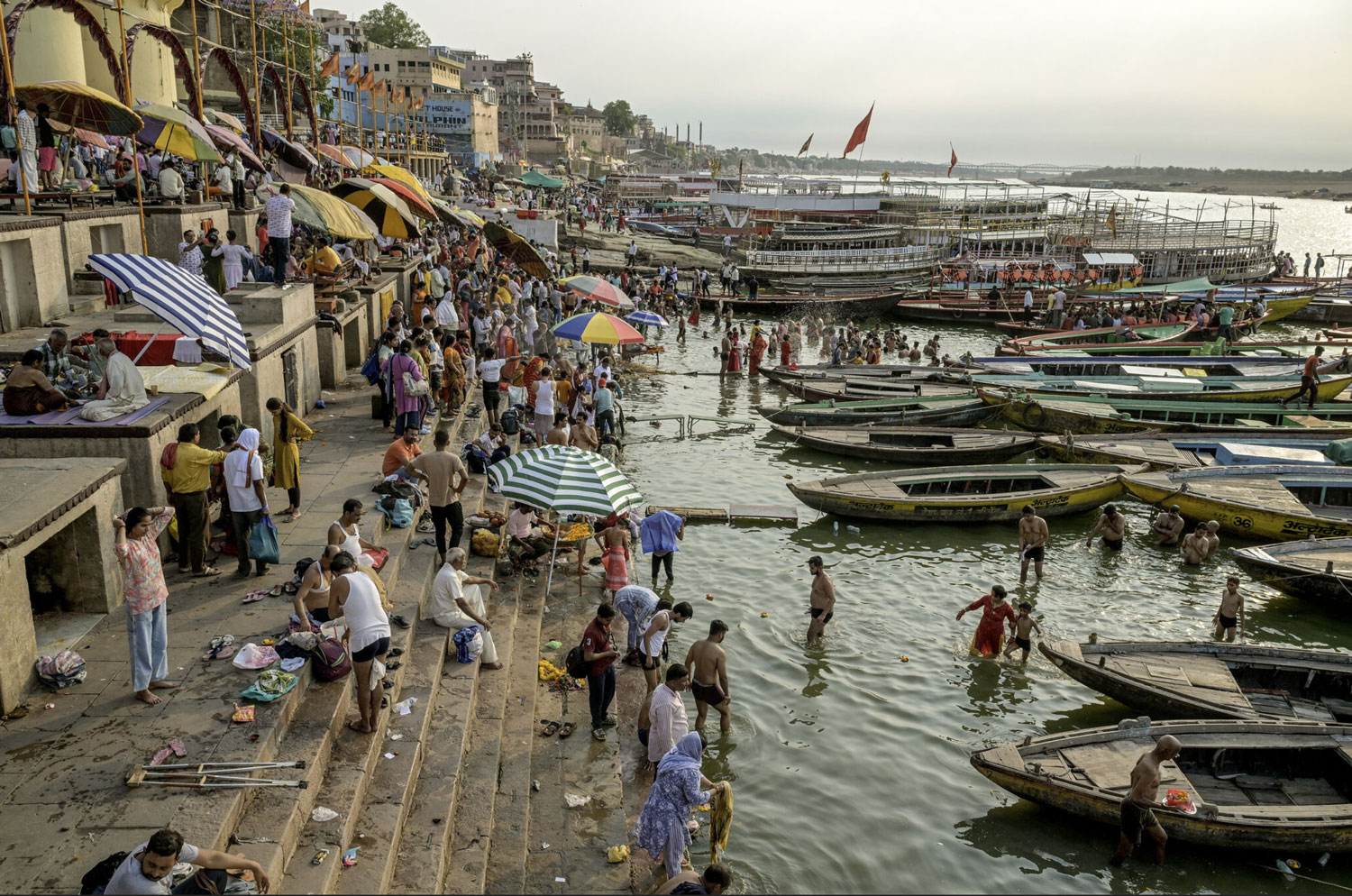 People immersing themselves in the sacred Ganges. The water is fairly polluted.