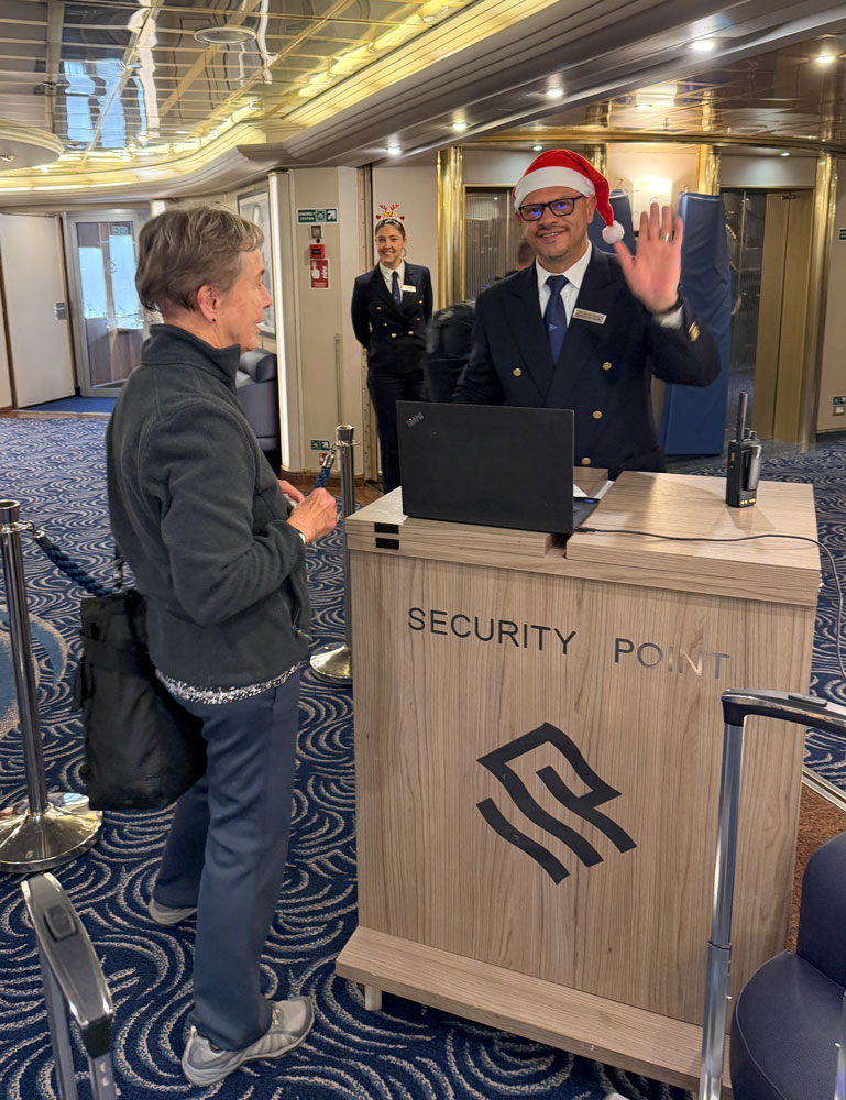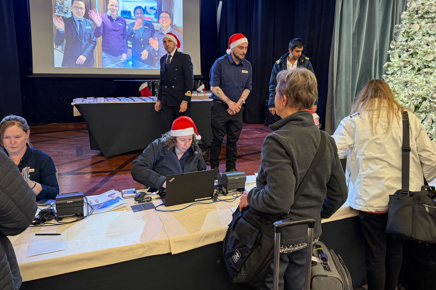 Then we went to the theater where we did the real check-in. We gave up our passports, gave them a credit card impression, and got our key cards. I asked how many guests were on the cruise and was told that it was 275. They said it was a full-house for an Antarctic cruise.