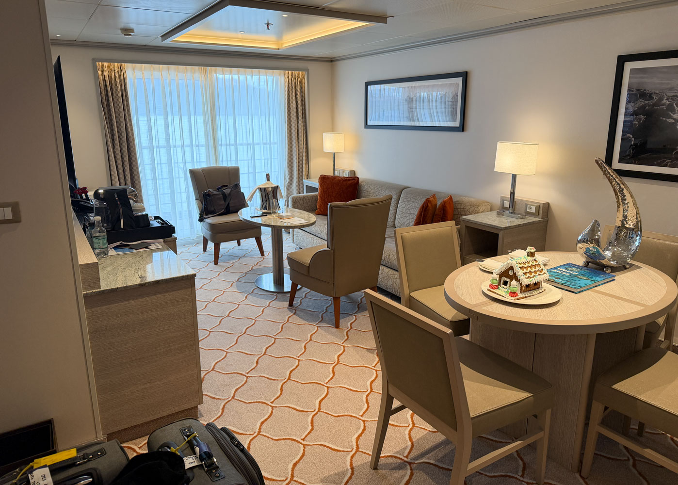 It's the same as the room we had back in 2021. It has two steps down to a sitting area, which I find unusual and a bit of a safety problem. If you got up at night, in the dark, to go to the bathroom and stepped in the wrong place, you could wind up flat on your face.