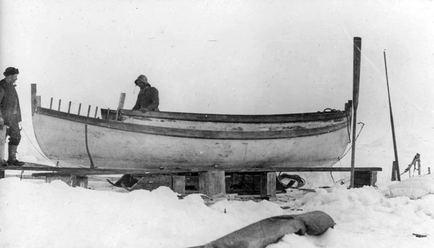 Shackleton immediately recognized that they had to get help and arranged for the James Caird to be prepared for the 800 mile voyage to South Georgia Island. Here's a picture of the carpenter, Harry McNeish, working to raise the gunwales of the James Caird. He also covered a major portion of boat.