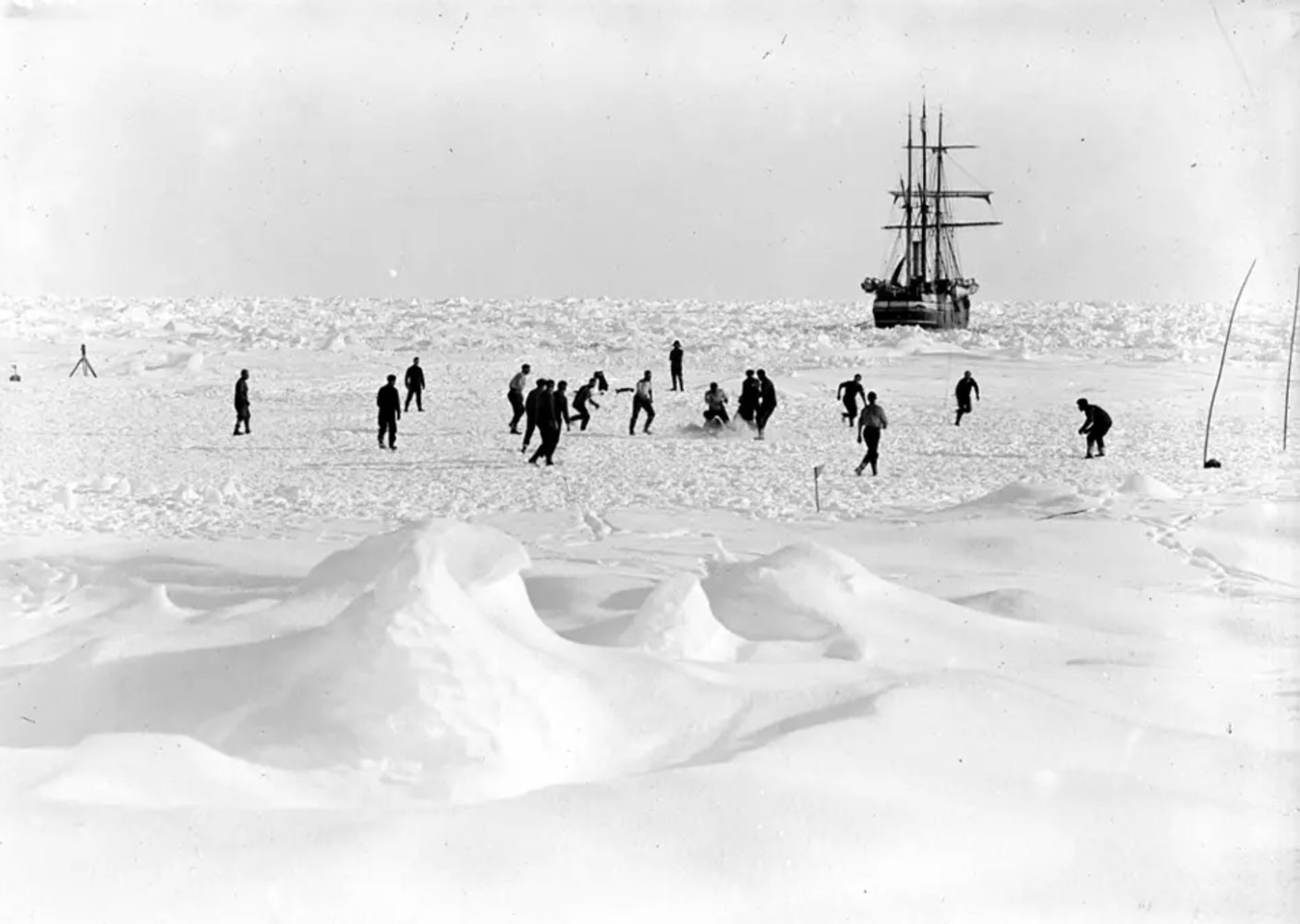 Life settled down to a routine. They hunted seals and penguins for food, especially for the dogs. Here the crew is playing some sport on the ice.