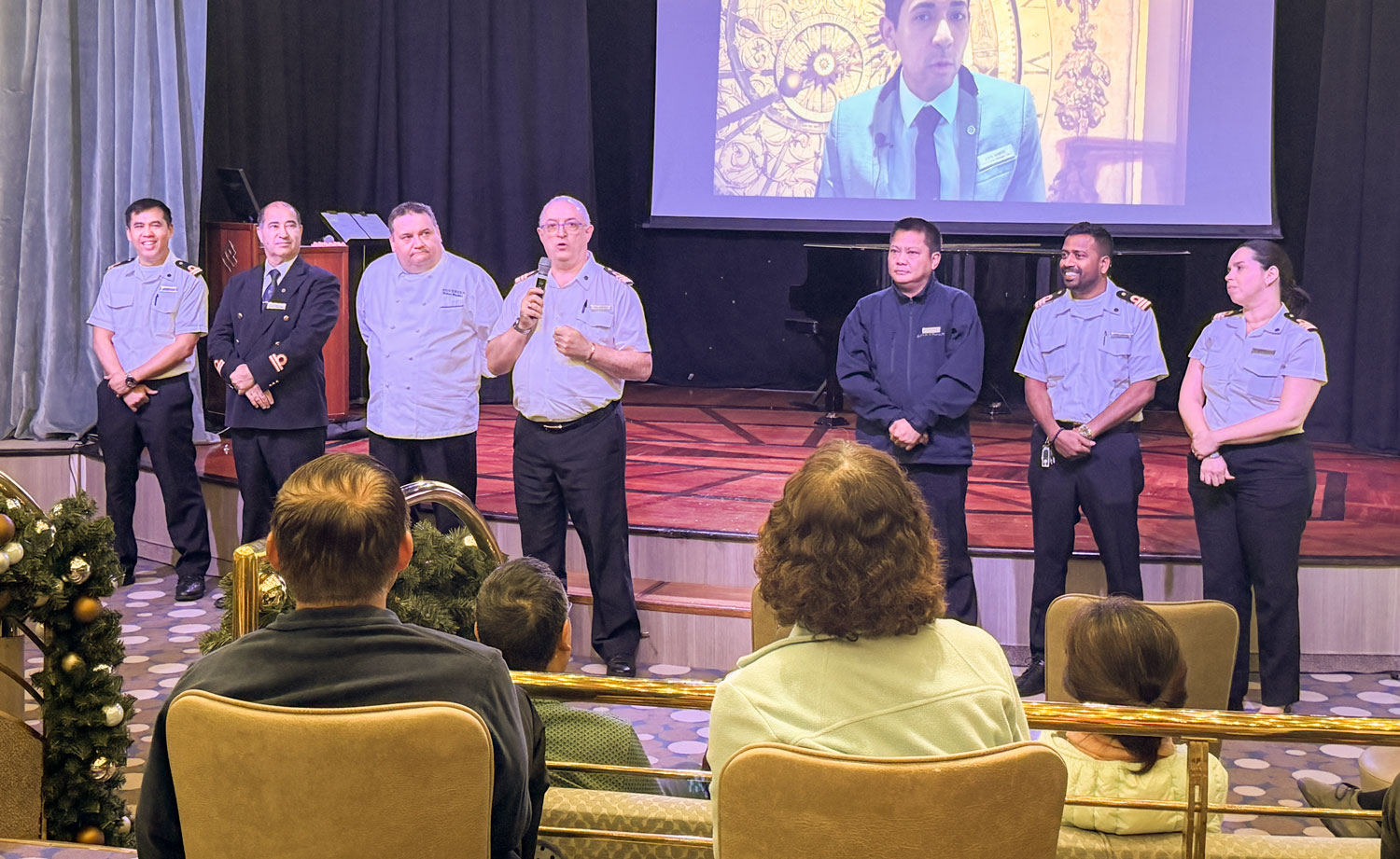 At 11am we played our last Trivia game, and came out second. At 11:30 we went to a presentation by the "hotel" staff. They answered questions posed by the guests about the operation of the "hotel" part of the ship - the food service, the laundry, the butlers, the cabin attendants, etc. The hotel manager, speaking, had a thick Italian accent. He commented that his wife didn't speak English very well. Then he added, "She's Australian".